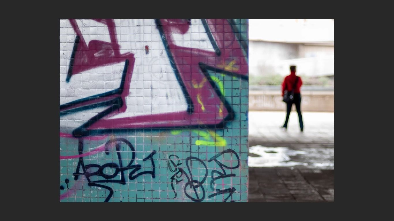 - Visual tension – the car exiting the frame so close to the edge of the frame adds a dynamic quality, not least because of those rooftops that catch your attention